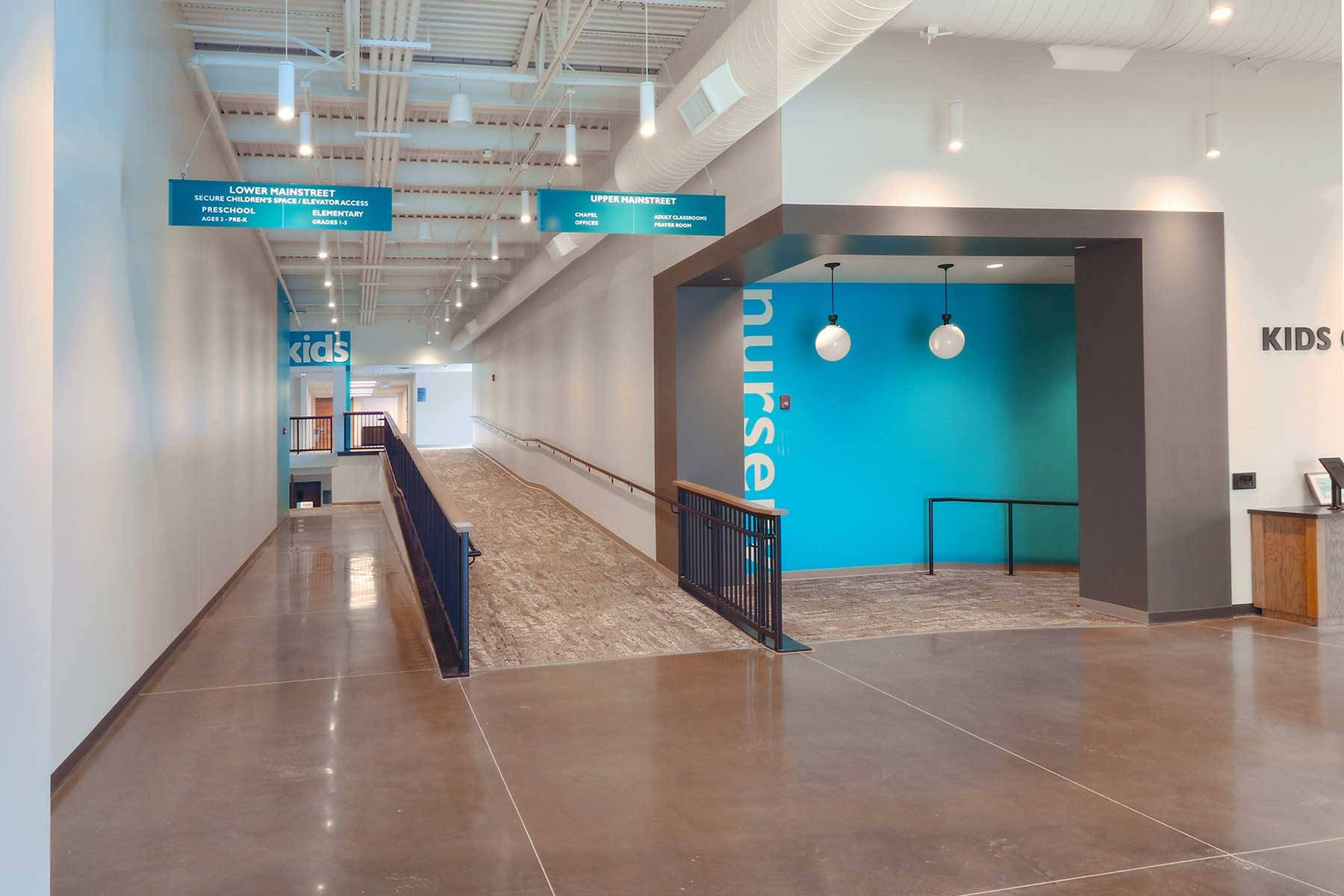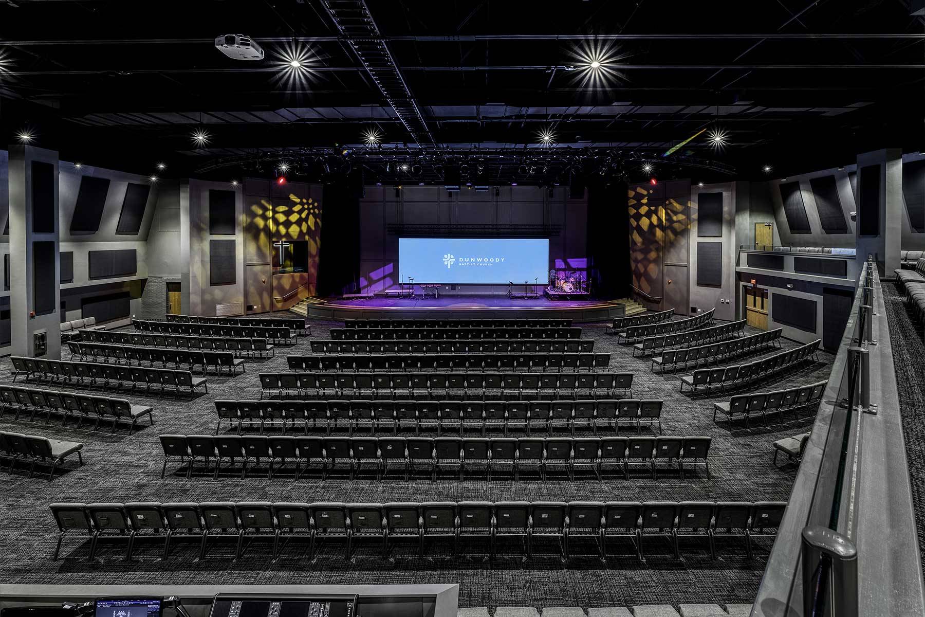 The Dunwoody Baptist Church expansion project aimed to create a more cohesive and accessible campus. In the first phase, 8,280 square feet were renovated, including the main entry hall, rally room, media room, restrooms, and classrooms. A new “Mainstreet” corridor connected several buildings, with enclosed breezeways between Buildings D and E and expanded access in Building A. The preschool rally room was relocated, and a ramp replaced stairs for easier navigation. The second phase added 11,000 square feet and renovated 17,000 square feet to expand worship and gathering spaces, modernizing the worship center and improving accessibility to better serve congregants.